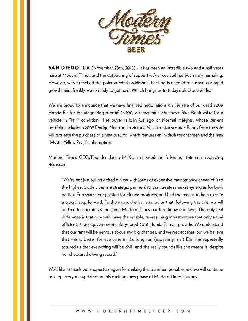 In a separate, but related story, Modern Times Beer, founded by Stone alumnus Jacob McKean, posted this humorous troll: